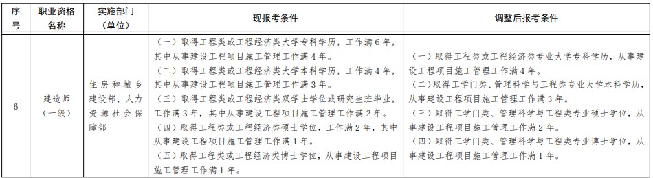 人社部近期公布《关于降低或取消部分准入类职业资格考试工作年限要求有关事项的通知》,一级建造师考试工作年限有所降低,详情如下: